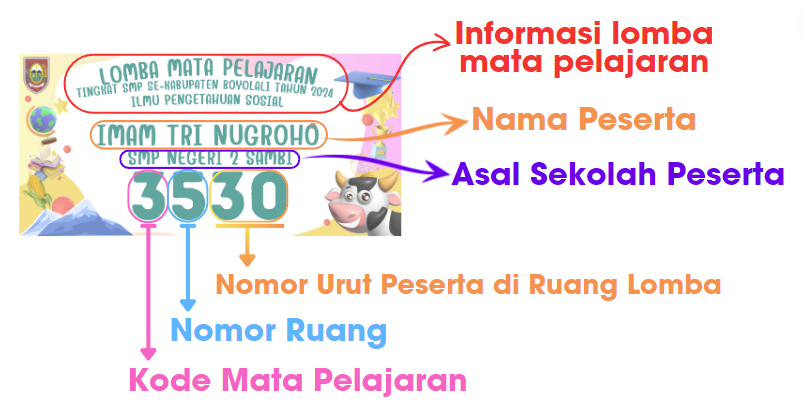 - Panduan pembacaan nomor peserta dan label meja peserta;