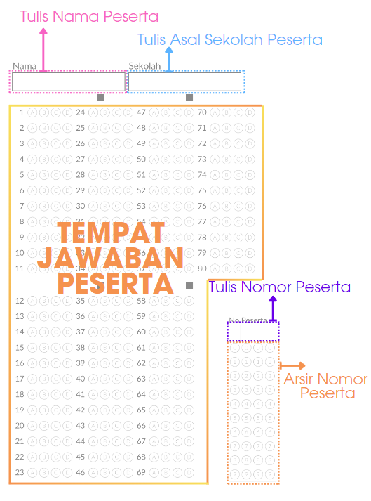 Pada saat pelaksanaan nanti, 2 digit pertama pada nomor peserta sudah tercetak pada lembar jawab peserta, sehingga peserta cukup hanya memasukkan 2 digit terakhir nomor peserta. Jadi jika nanti menemukan bahwa 2 digit pertama pada bagian nomor peserta sudah terisi, jangan panik dan jangan bingung.
