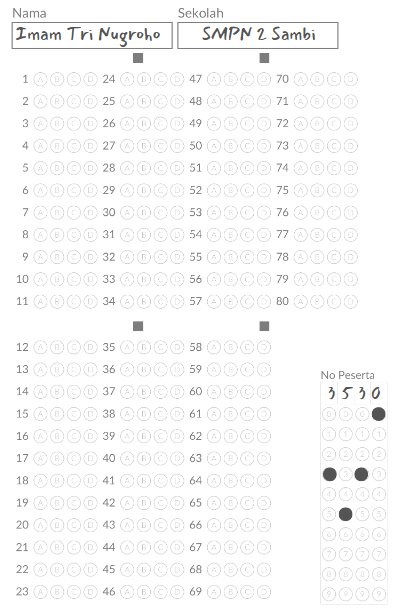Seperti informasi di atas, maka lembar jawab untuk peserta mata pelajaran IPS dengan nama peserta Imam Tri Nugroho dari SMPN 2 Sambi dengan nomor peserta 3530 adalah sebagai berikut ini.