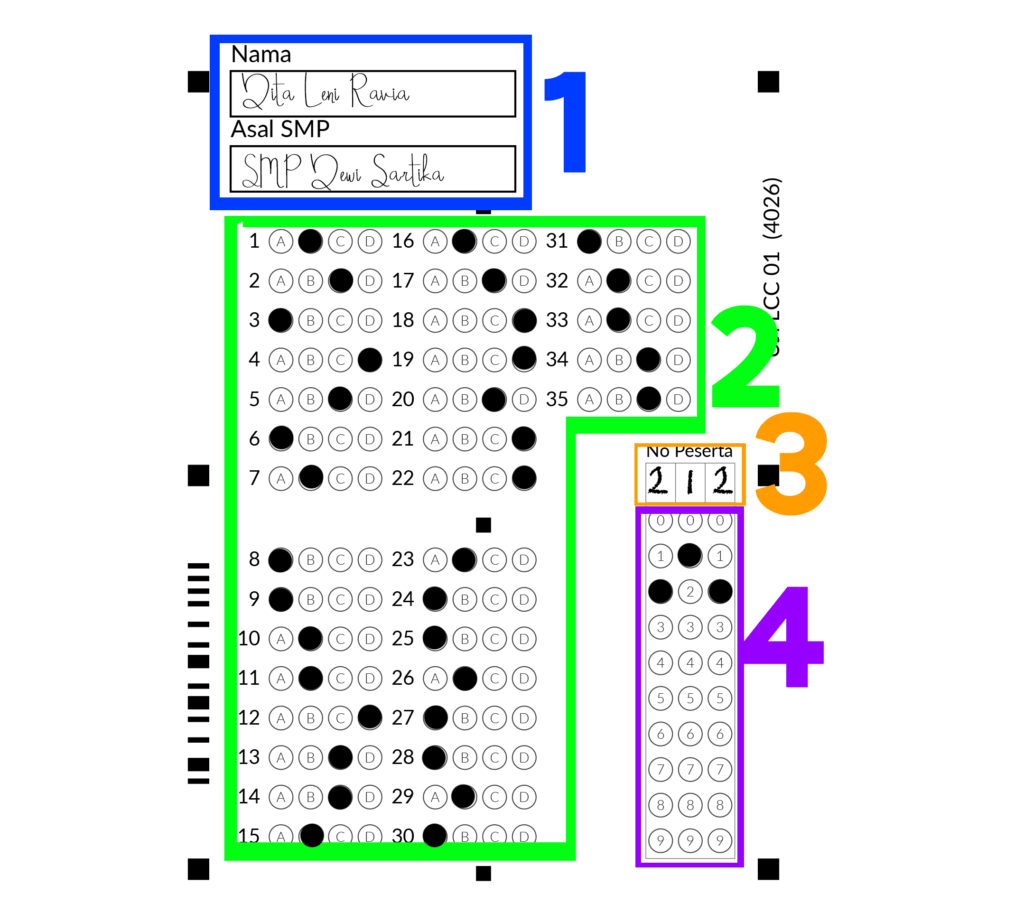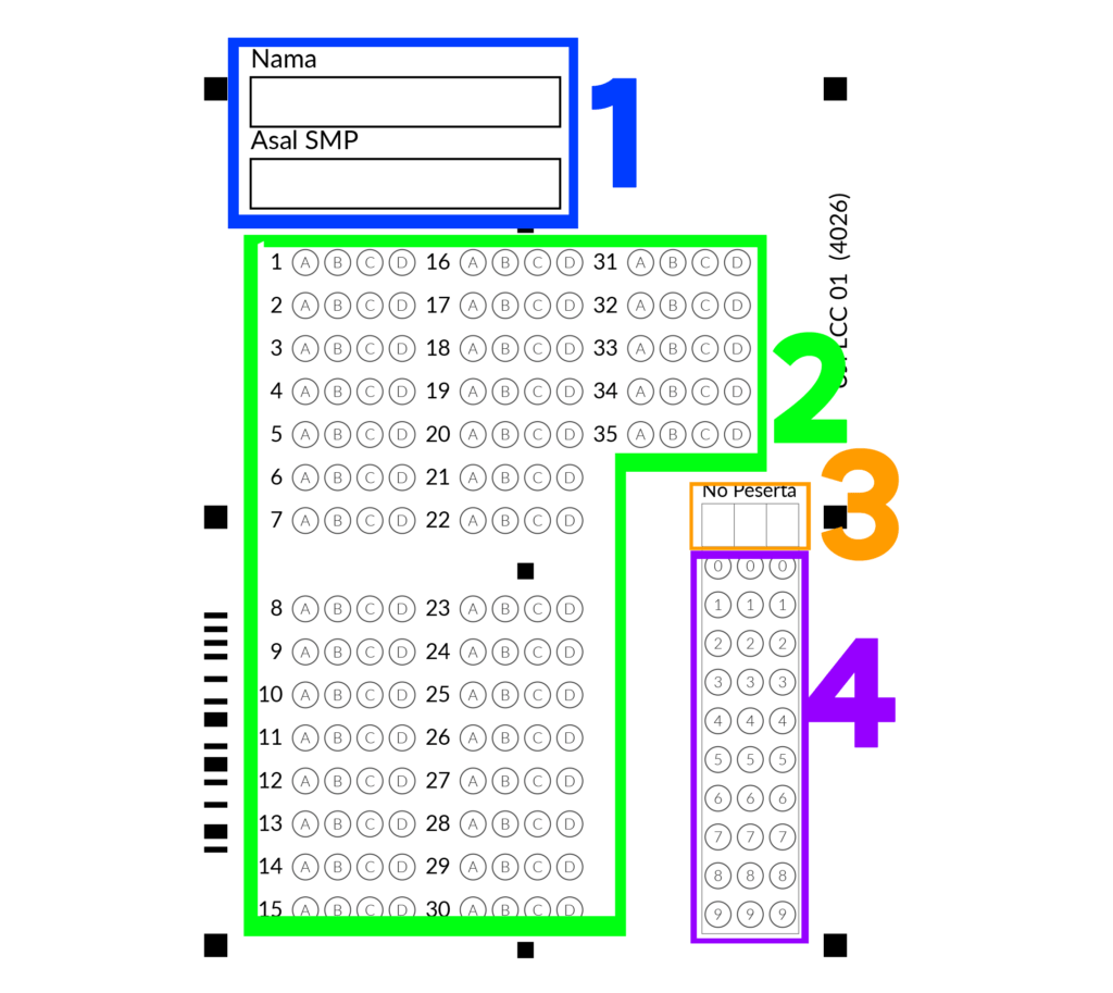 - Nomor 4 (ungu) : Tempat peserta melingkari nomor peserta. Digunakan untuk pemindaian data peserta ke dalam sistem.